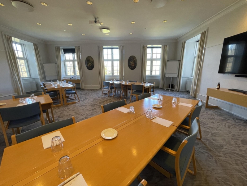 Mødelokalet er lyst og rummeligt og ligger i slottets hjørnet mod vest med pragtfuld udsigt over parken.